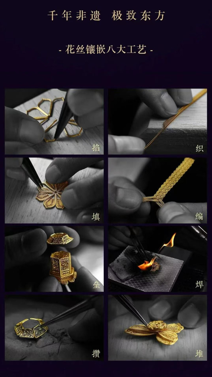 寶蘭的特质在于其成熟的“花丝镶嵌”能力。公司曾吸纳了多位国家级非物质文化遗产“花丝镶嵌”技艺的传承大师及其弟子,“该技艺要求匠人将黄金千锤百炼、抽拔成丝,再以指尖演绎掐、填、攒、焊等数十道细腻工序,使细过毫发的金丝在时光中交织、堆垒、编织成灵动繁复的立体纹样。”